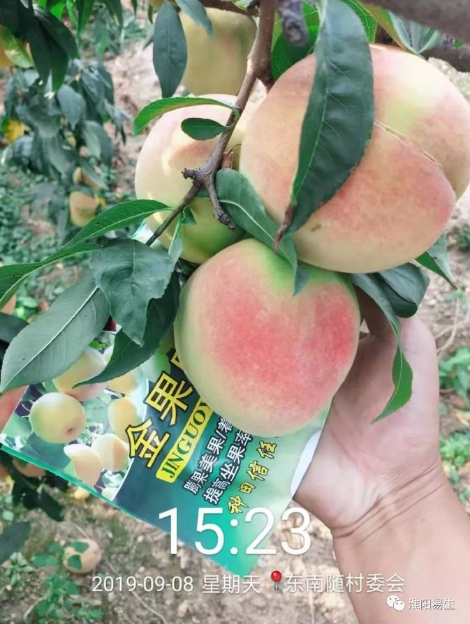 2019年易生科技售后服務(wù)組來(lái)到山東平度市店子鎮進(jìn)行噴施金果園的效果回訪(fǎng),可以看到噴施過(guò)金果園的毛桃個(gè)頭大且均勻,顏色鮮亮,上色均勻,每個(gè)毛桃直徑都在80-90mm以上。未噴施金果園的毛桃個(gè)頭小,且果皮表面有一層灰白色的物質(zhì),霧蒙蒙的感覺(jué)不鮮亮。